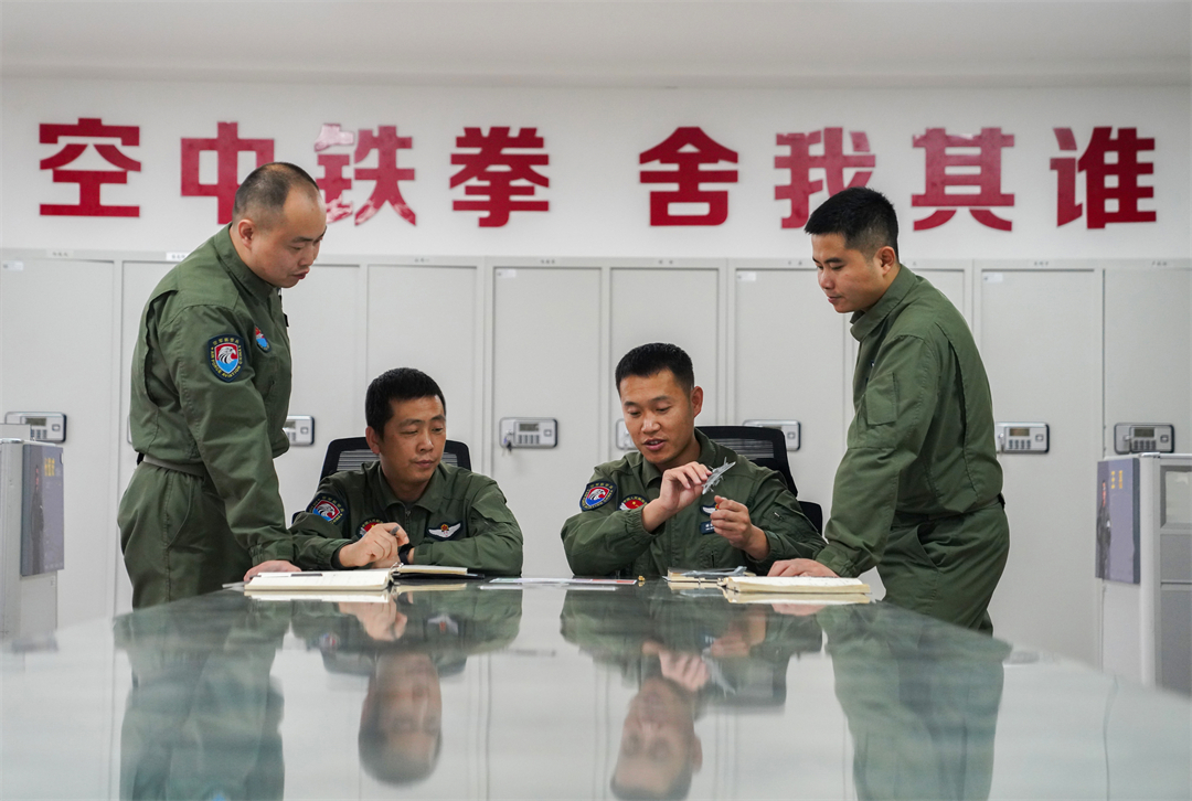 圖為空軍“王海大隊(duì)”飛行員進(jìn)行空戰(zhàn)戰(zhàn)術(shù)復(fù)盤(pán)研究。師勇進(jìn) 攝
