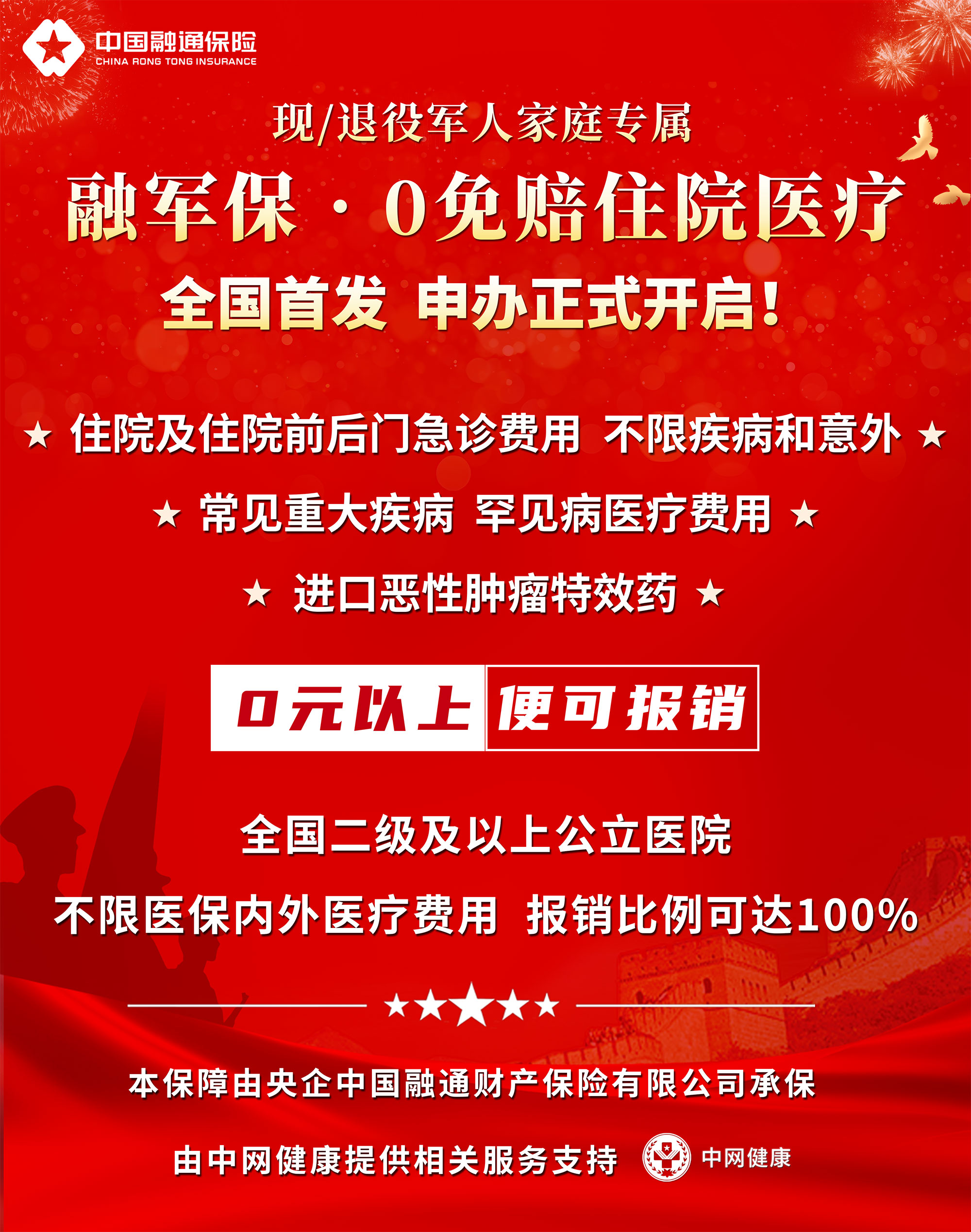 為深入貫徹落實(shí)黨的二十大關(guān)于退役軍人工作重要部署,履行“為軍惠軍”職責(zé)使命,體現(xiàn)中央企業(yè)服務(wù)經(jīng)濟(jì)社會(huì)高質(zhì)量發(fā)展的“國家隊(duì)、排頭兵”作用,進(jìn)一步提升退役軍人保險(xiǎn)保障水平。中國融通保險(xiǎn)發(fā)揮自身為軍服務(wù)“專門化、專業(yè)化”服務(wù)優(yōu)勢(shì),聚焦現(xiàn)/退役軍人家庭醫(yī)療現(xiàn)實(shí)需求,于2024年3月14日,聯(lián)合中網(wǎng)健康正式上線了《融軍?!?免賠住院醫(yī)療》保險(xiǎn)產(chǎn)品。此產(chǎn)品由中國融通保險(xiǎn)全面負(fù)責(zé)定制研發(fā),由中網(wǎng)健康提供相關(guān)配套服務(wù)支持。該保險(xiǎn)因其“0免賠”的保障優(yōu)勢(shì),真正實(shí)現(xiàn)了“看病住院,小錢、大錢均可報(bào)銷”。