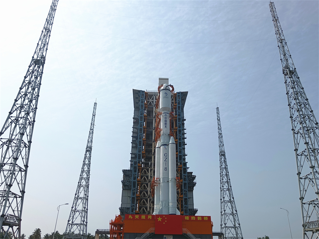 南海之濱,海天之間,高大挺拔的長征八號遙三運(yùn)載火箭傲然矗立、劍指蒼穹,鵲橋二號中繼星發(fā)射在即。
