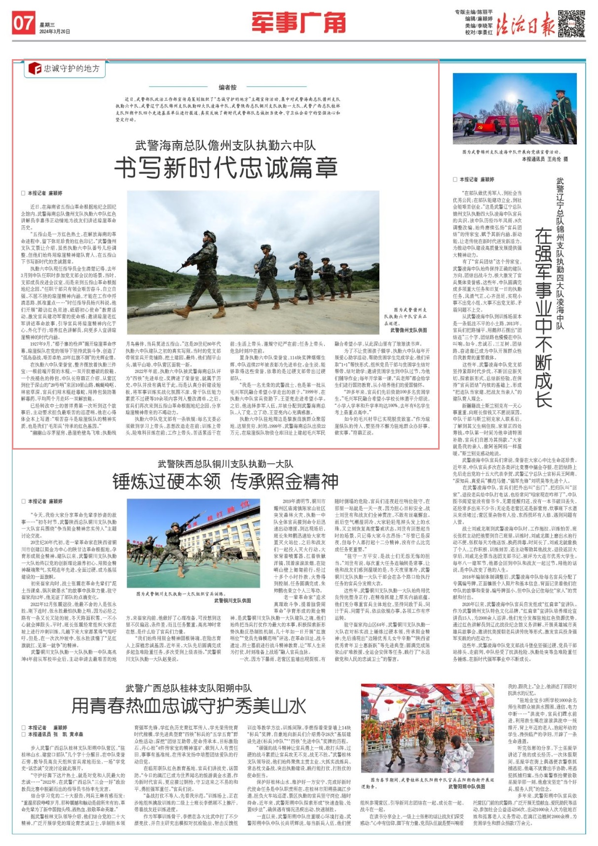 近日,武警部隊(duì)政治工作部宣傳局策劃組織了“忠誠(chéng)守護(hù)的地方”主題宣傳活動(dòng),集中對(duì)武警海南總隊(duì)儋州支隊(duì)執(zhí)勤六中隊(duì)、武警遼寧總隊(duì)錦州支隊(duì)執(zhí)勤四大隊(duì)凌海中隊(duì)、武警陜西總隊(duì)銅川支隊(duì)執(zhí)勤一大隊(duì)、武警廣西總隊(duì)桂林支隊(duì)陽(yáng)朔中隊(duì)四個(gè)先進(jìn)基層單位進(jìn)行報(bào)道,真實(shí)反映了新時(shí)代武警部隊(duì)忠誠(chéng)擔(dān)當(dāng)使命、守衛(wèi)社會(huì)安寧的堅(jiān)強(qiáng)決心和堅(jiān)定行動(dòng)。