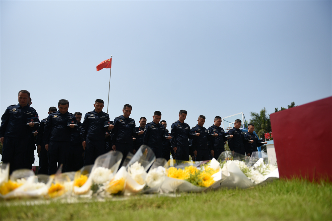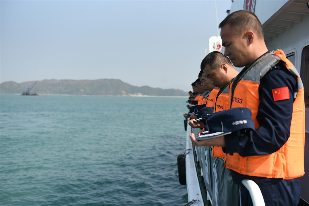 “全體都有!脫帽,默哀?!卑殡S著現(xiàn)場指揮員下達(dá)口令,船艇汽笛長鳴、響徹海天,全體人員整齊列隊、脫帽肅立。
