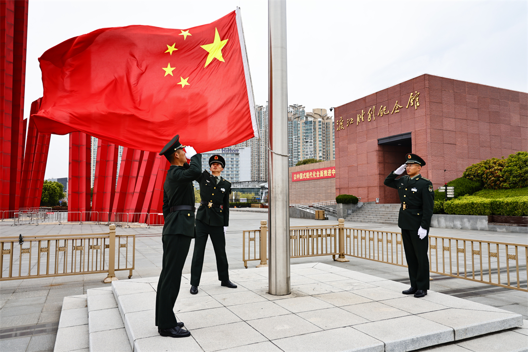 圖為3月31日,陸軍工程大學(xué)通信工程學(xué)院某大隊(duì)學(xué)員聯(lián)合共建學(xué)校南京市后標(biāo)營(yíng)小學(xué)師生,來到渡江勝利紀(jì)念館渡江勝利廣場(chǎng)舉行升旗儀式,緬懷革命先烈。白云朗 攝