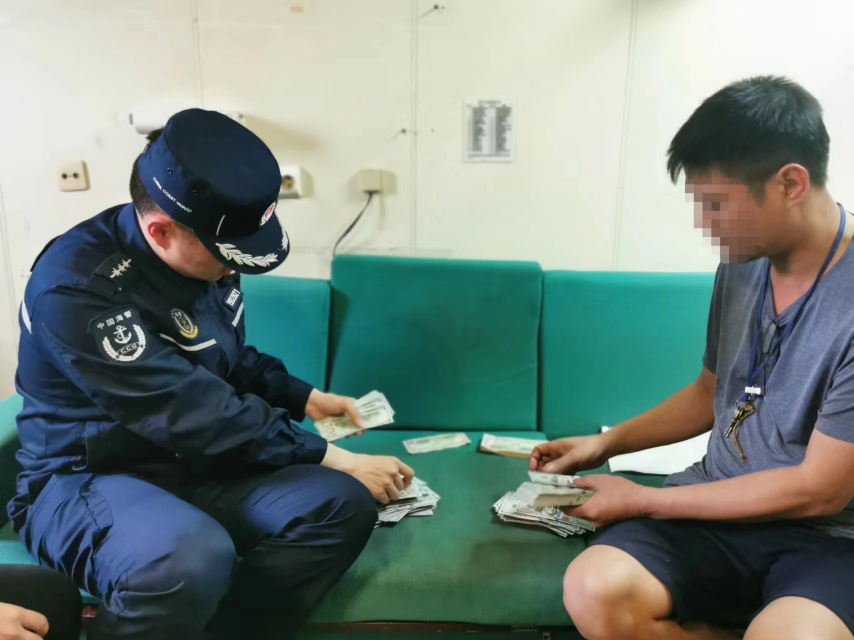 圖為執(zhí)法員對外籍貨輪進(jìn)行現(xiàn)場檢查。