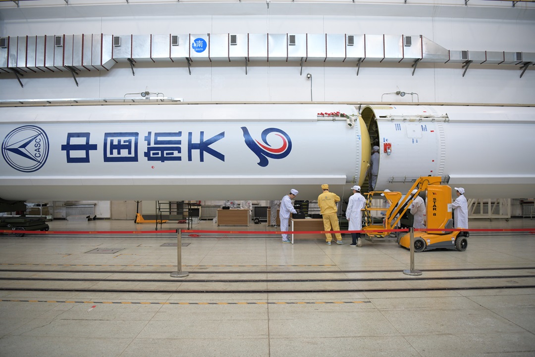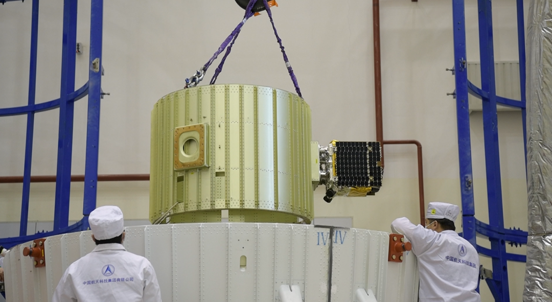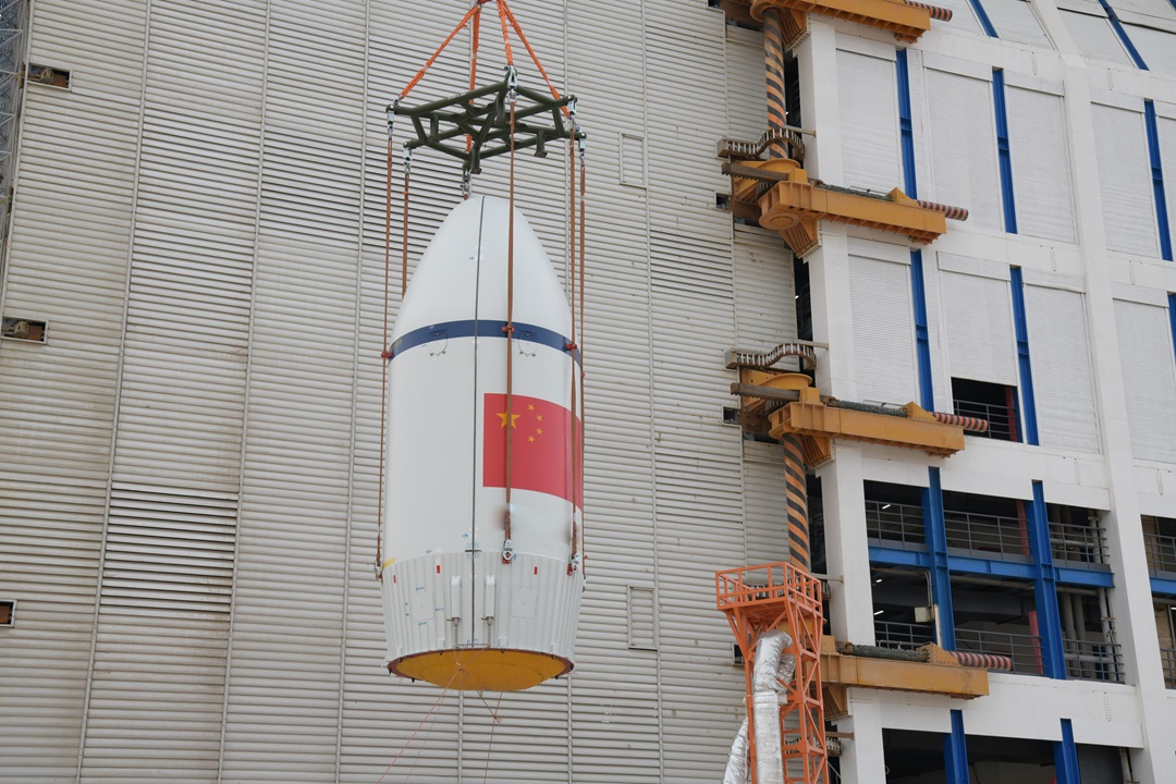 圖為總裝人員進(jìn)行一級(jí)箭體對(duì)接。
