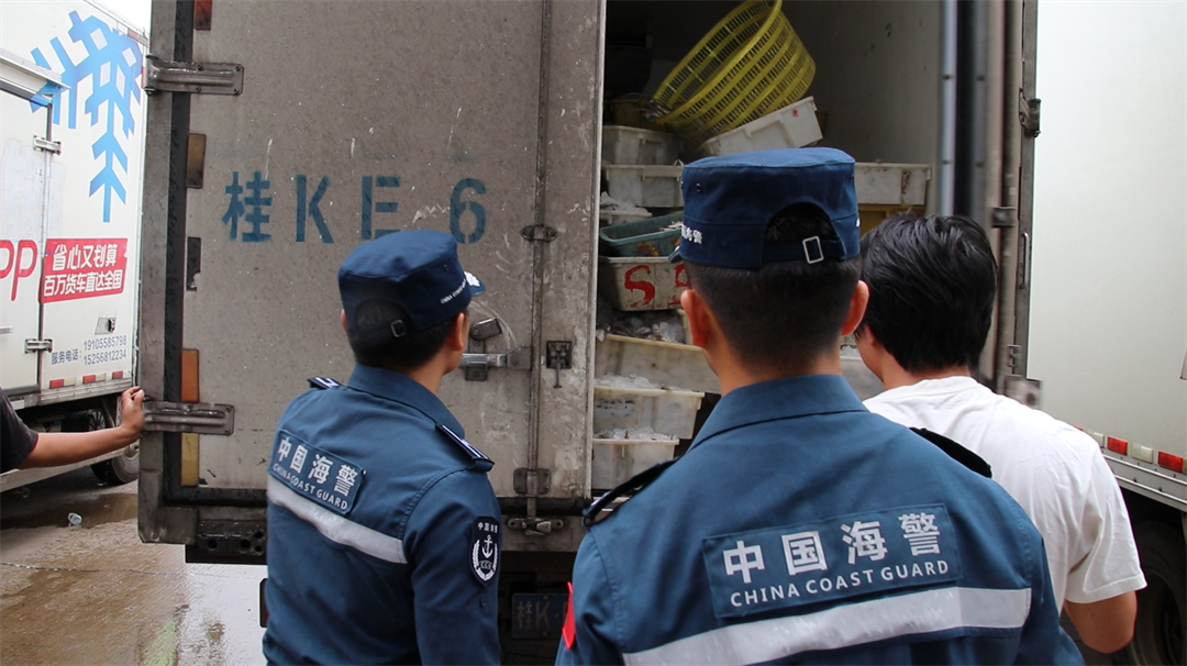 圖為海警執(zhí)法員對(duì)查獲的漁獲物進(jìn)行檢查。