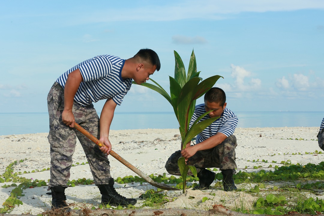 圖為西沙守備部隊官兵種植椰子樹。張鐘鑫 攝