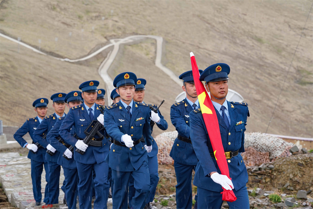 一路登高向上,氧氣逐漸稀薄,高原反應(yīng)不期而至,但大家參與的熱情卻格外高漲。湛藍的天空,屹立的雷達防風(fēng)罩,伴隨著雄壯的國歌聲,鮮艷的五星紅旗冉冉升起。在海拔5374米的陣地上,大家迎著勁風(fēng)肅然佇立,仰望國旗致敬,向著雪山和甘愿奉獻青春、守衛(wèi)祖國領(lǐng)空的戰(zhàn)士致敬!
