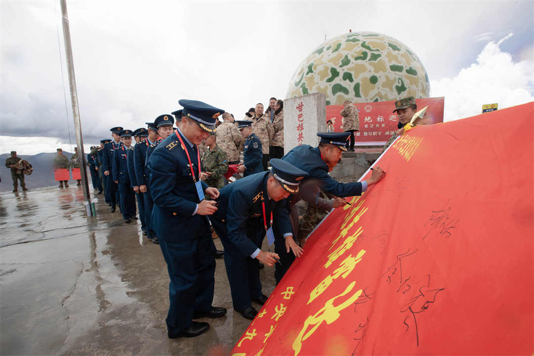 圖為“甘巴拉英雄雷達站”授稱30周年之際,甘巴拉基層代表登上5374米的陣地,在軍旗上簽名。溫志軍 攝