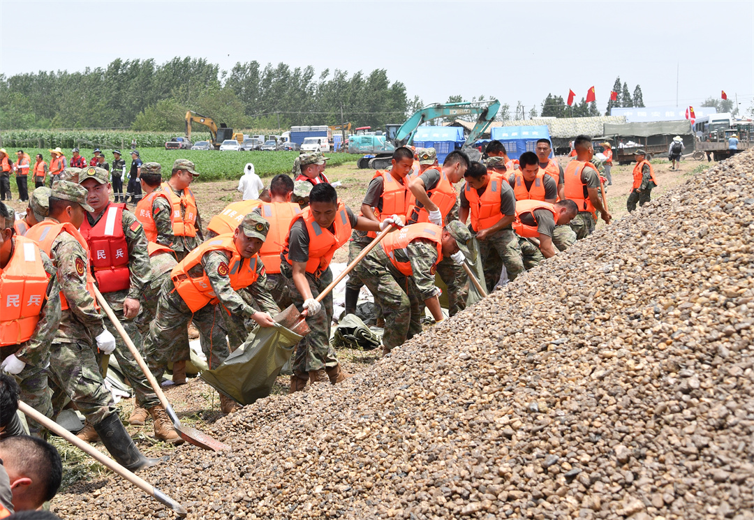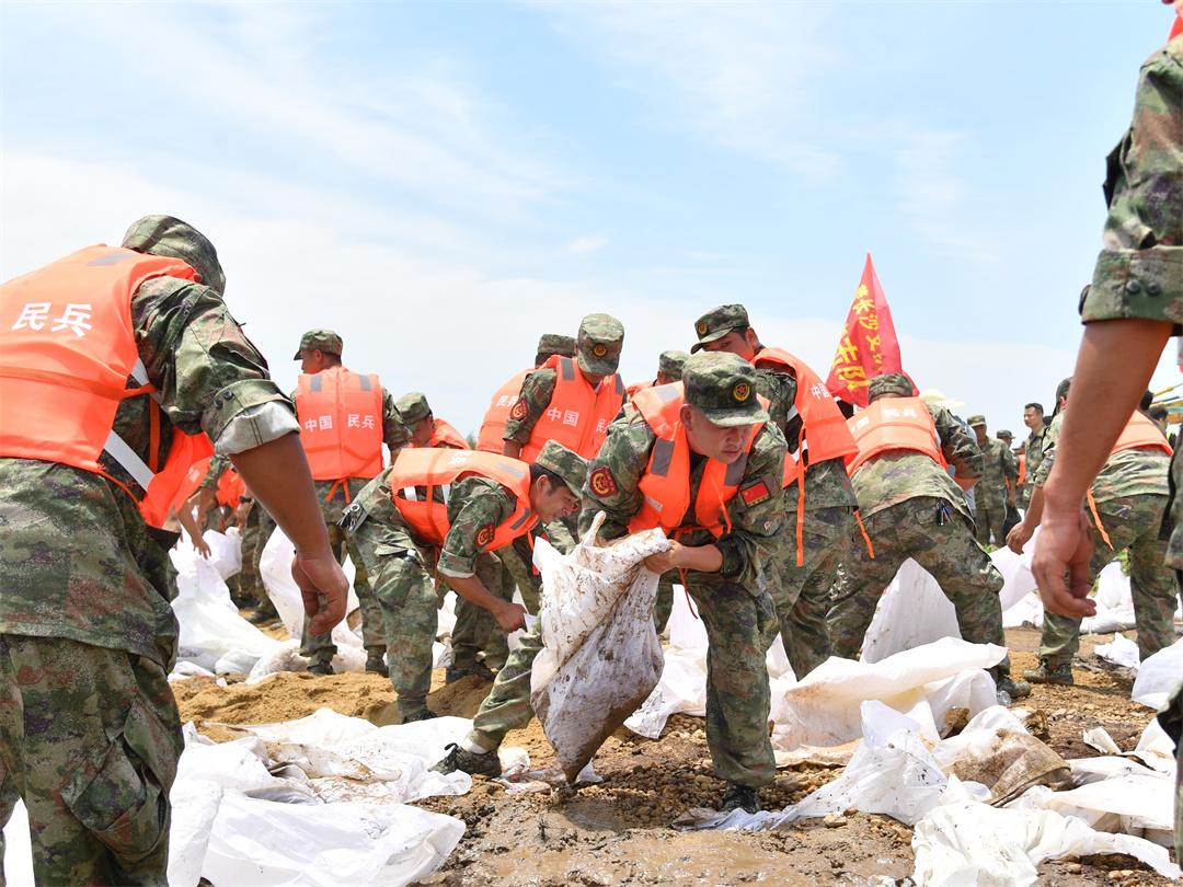 在專家指導(dǎo)下,經(jīng)過軍地?fù)岆U人員緊急處置,7月8日13時,管涌險情得到初步控制。放眼望去,官兵和民兵們沖鋒的身影構(gòu)筑起一道“迷彩長堤”。