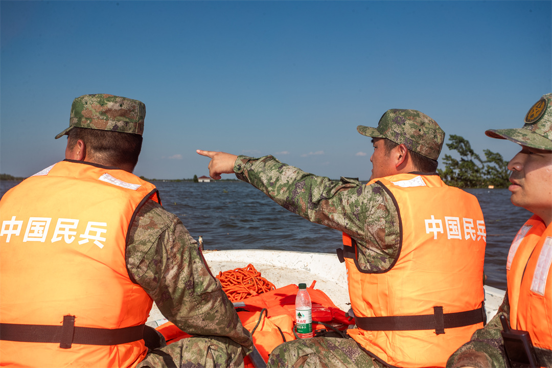 “你們操舟在前面,我們在后方策應(yīng)。”身著紅色救生衣的陸琪用洪亮的口令和簡單干練的手勢指揮搜救現(xiàn)場民兵。