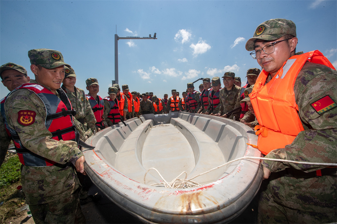 圖為湖南省軍區(qū)民兵攜帶沖鋒舟開展搶險救援工作。張必聞 攝