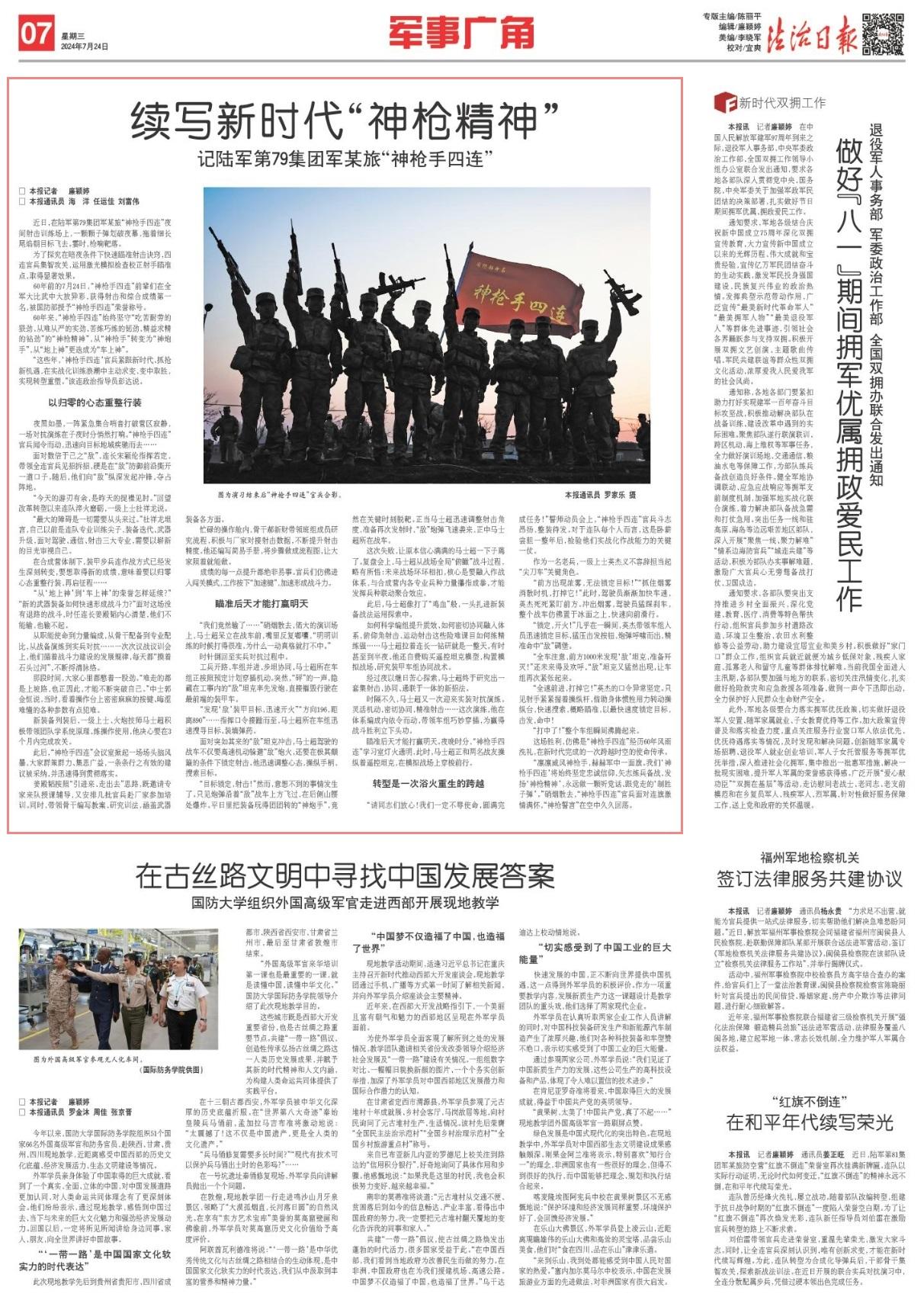 60年前的7月24日,“神槍手四連”前輩們在全軍大比武中大放異彩,獲得射擊和綜合成績第一名,被國防部授予“神槍手四連”榮譽稱號。