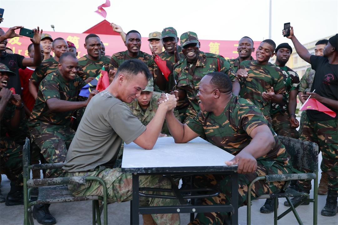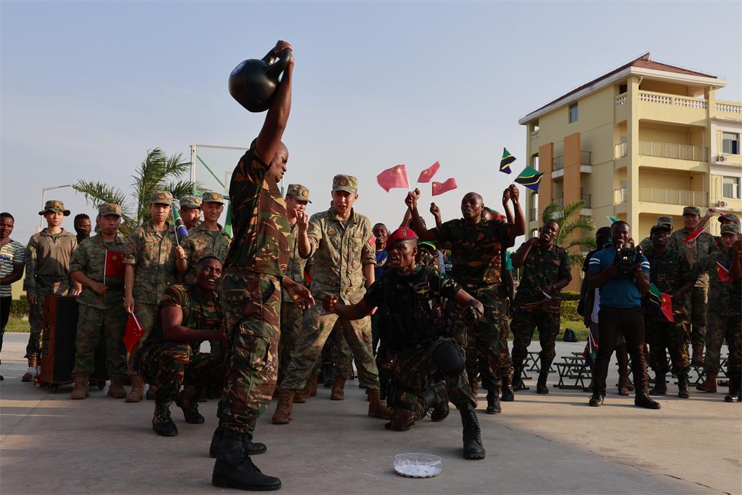 比賽結(jié)束后,雙方領(lǐng)導(dǎo)為優(yōu)勝團隊合影留念,兩國官兵遲遲不愿離場,又自發(fā)開展了軍體拳、捕俘拳等交流活動。大家仔細觀看,躍躍欲試,歡呼聲和加油聲此起彼伏,一浪蓋過一浪。中方官兵現(xiàn)場主動教學(xué),將中華優(yōu)秀傳統(tǒng)文化介紹給坦方友人,大家在友好交流中不斷深化了解,在歡聲笑語間感受中華文化的獨特魅力。