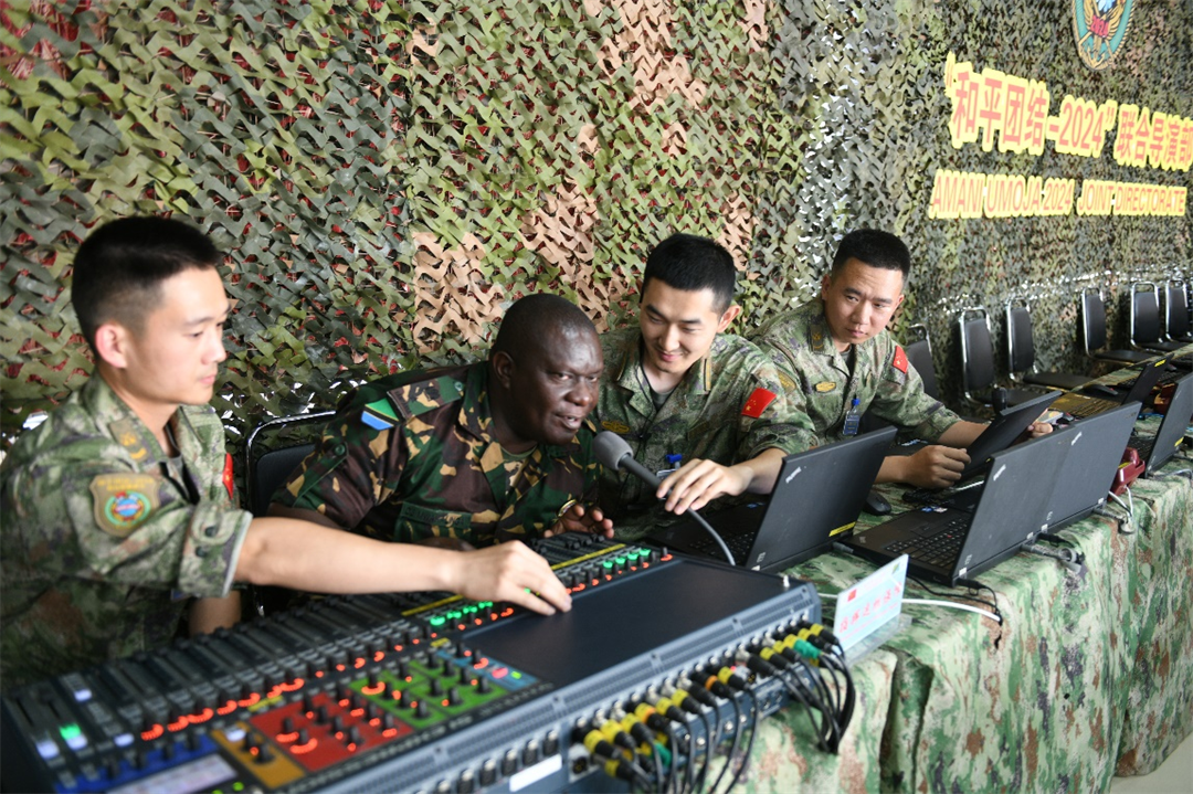 “Can you hear me?”“It sounds good!”近日,在中坦雙方后臺(tái)保障人員精心調(diào)試下,“和平團(tuán)結(jié)-2024”聯(lián)合演習(xí)導(dǎo)播控制系統(tǒng)建立完畢,各類信息系統(tǒng)準(zhǔn)備就緒。