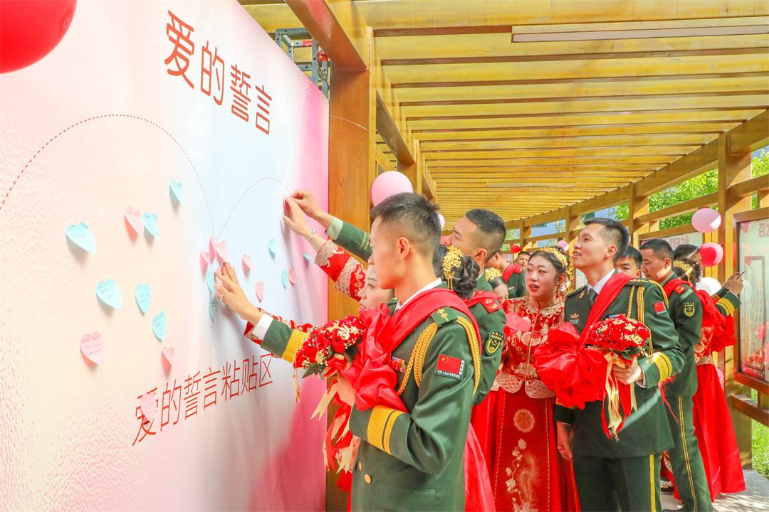 真情告白、相互對拜、宣讀家訓……一個個環(huán)節(jié)環(huán)環(huán)相扣,不斷把婚禮氛圍推向高潮。這場隆重熱烈的集體婚禮,既是新人們相識相知相戀、修成愛情正果的畢業(yè)典禮,更是他們攜手人生旅途、共創(chuàng)美好未來的啟航儀式。橄欖綠與婚紗白水乳交融,演繹出一場浪漫與奉獻的動人交響樂。