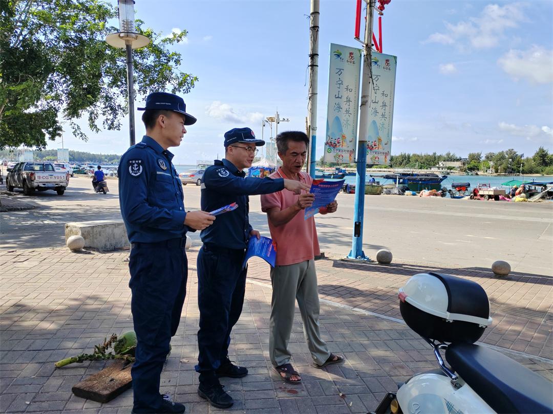 圖為8月14日,海南瓊海海警局在轄區(qū)碼頭進(jìn)行法治宣傳,執(zhí)法員向漁民群眾介紹相關(guān)法律法規(guī)、舉報途徑等。