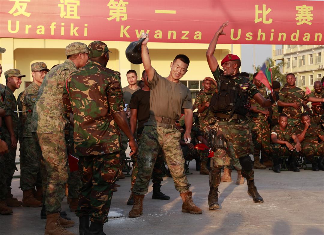 圖為壺鈴抓舉比賽中,坦方官兵正在為中方選手加油打氣。羅暄 攝