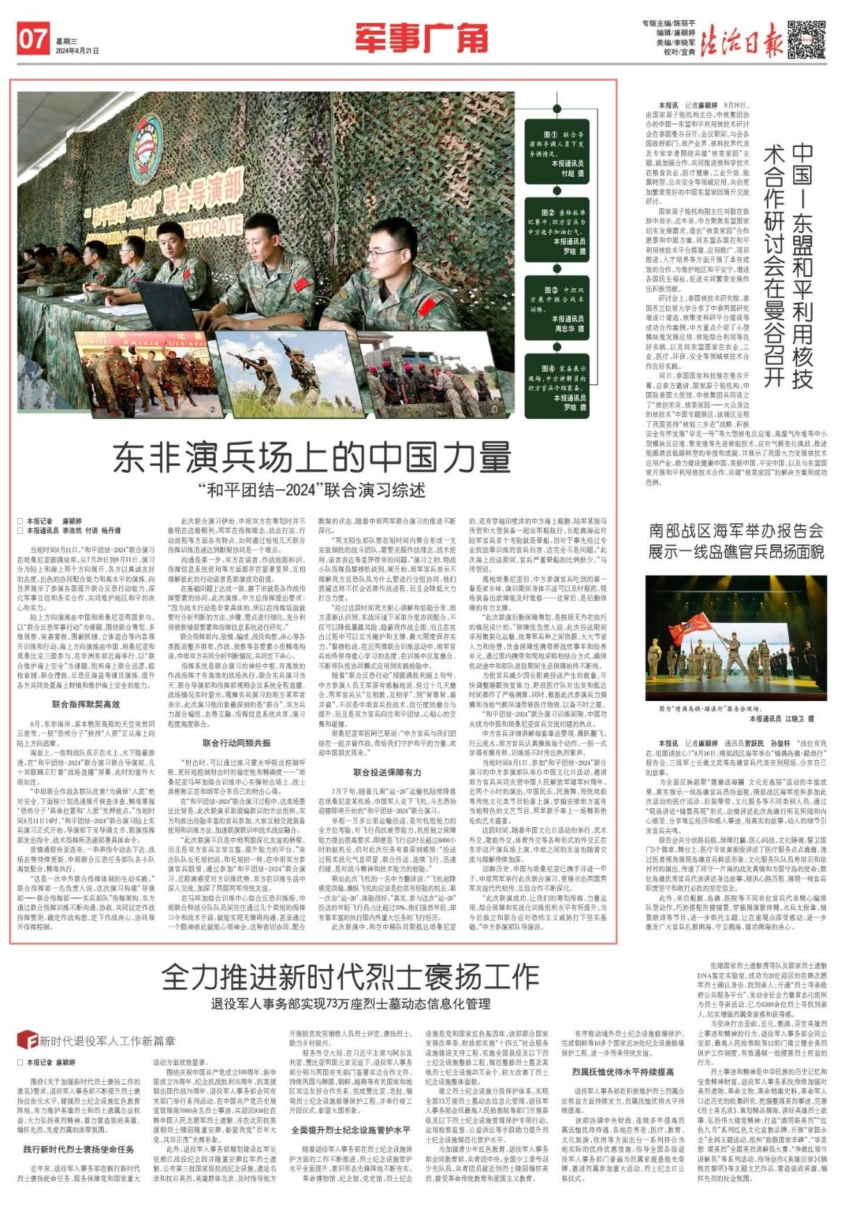 當(dāng)?shù)貢r間8月11日,“和平團結(jié)-2024”聯(lián)合演習(xí)在坦桑尼亞圓滿結(jié)束。從7月29日到8月11日,演習(xí)分為陸上和海上兩個方向展開,各方以真誠友好的態(tài)度、出色的協(xié)同配合能力和高水平的演練,向世界展示了參演各國提升聯(lián)合反恐行動能力、深化軍事互信和務(wù)實合作、共同維護地區(qū)和平的決心和實力。