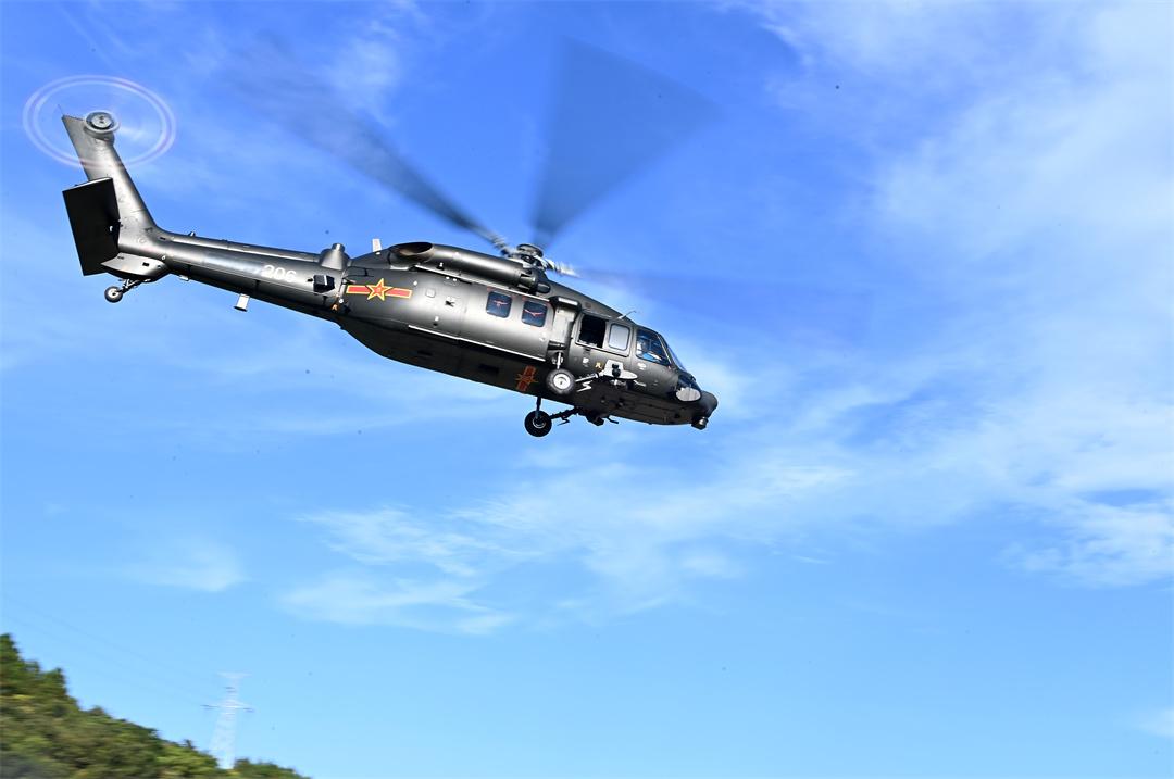 圖為直升機搭載作戰(zhàn)隊員飛赴機降地域。