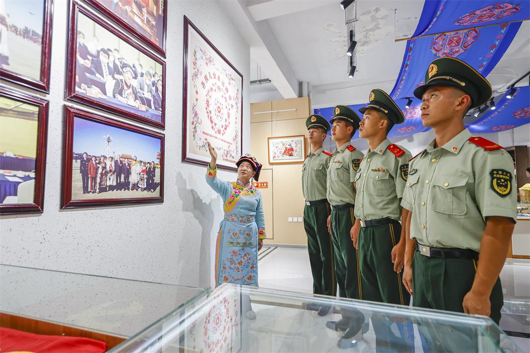 圖為繡娘為武警官兵講述羌繡知識。