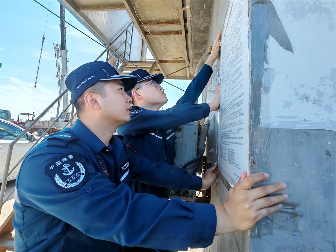 圖為山東煙臺海警局長島工作站執(zhí)法員在轄區(qū)北長山島北城碼頭張貼執(zhí)法公告。盧煜萱 攝