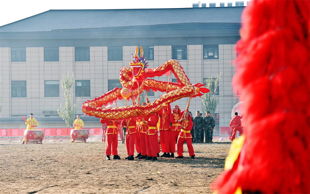開幕式現(xiàn)場(chǎng),由官兵演繹的節(jié)目“鑼鼓震天、龍騰獅舞”將氣氛推向高潮。具有濃厚“兵味”“戰(zhàn)味”的刺殺表演,彰顯了官兵能戰(zhàn)、善戰(zhàn)、勝戰(zhàn)的決心和意志。