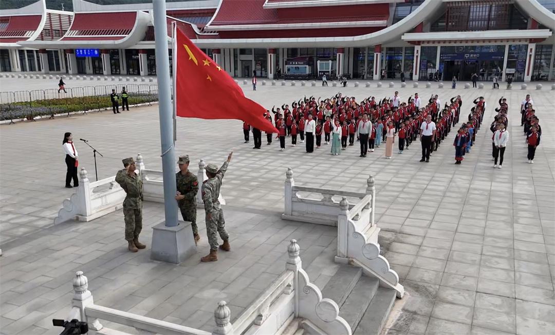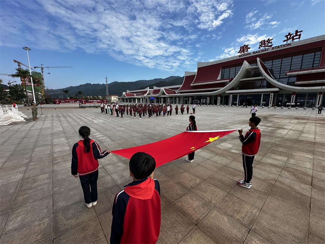 活動現(xiàn)場,由少先隊員代表組成的“紅領(lǐng)巾護(hù)旗手”方隊手持國旗入場,將國旗傳遞至磨憨國旗護(hù)衛(wèi)隊,護(hù)衛(wèi)隊邁著鏗鏘有力的步伐走向升旗臺。伴隨著莊嚴(yán)的國歌聲,這面意義非凡的國旗在磨憨鐵路邊檢站冉冉升起。