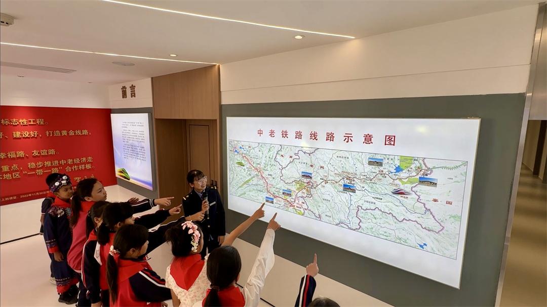 國旗傳遞儀式結(jié)束后,少先隊員們與普洱車務(wù)段磨憨站工作人員在磨憨鐵路口岸智慧展示中心開展“紅領(lǐng)巾愛祖國”交流活動。中心有關(guān)負(fù)責(zé)同志為少先隊員們講述了中老鐵路建設(shè)發(fā)展歷程。