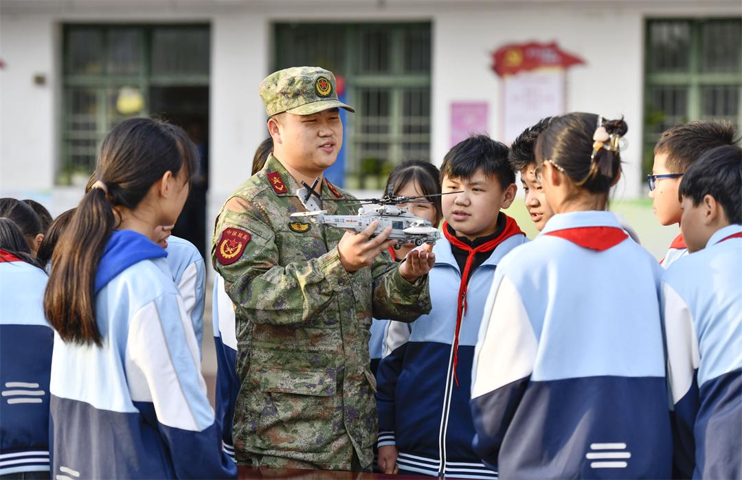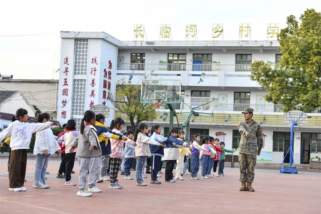 圖為在肥東縣長臨河學校中心小學,某部指導員魏力源和孩子們在一起。