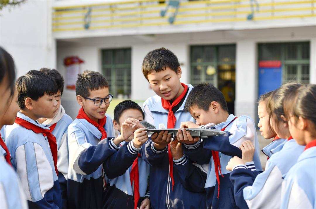 圖為在肥東縣長臨河學校中心小學,孩子們觀摩裝備模型。