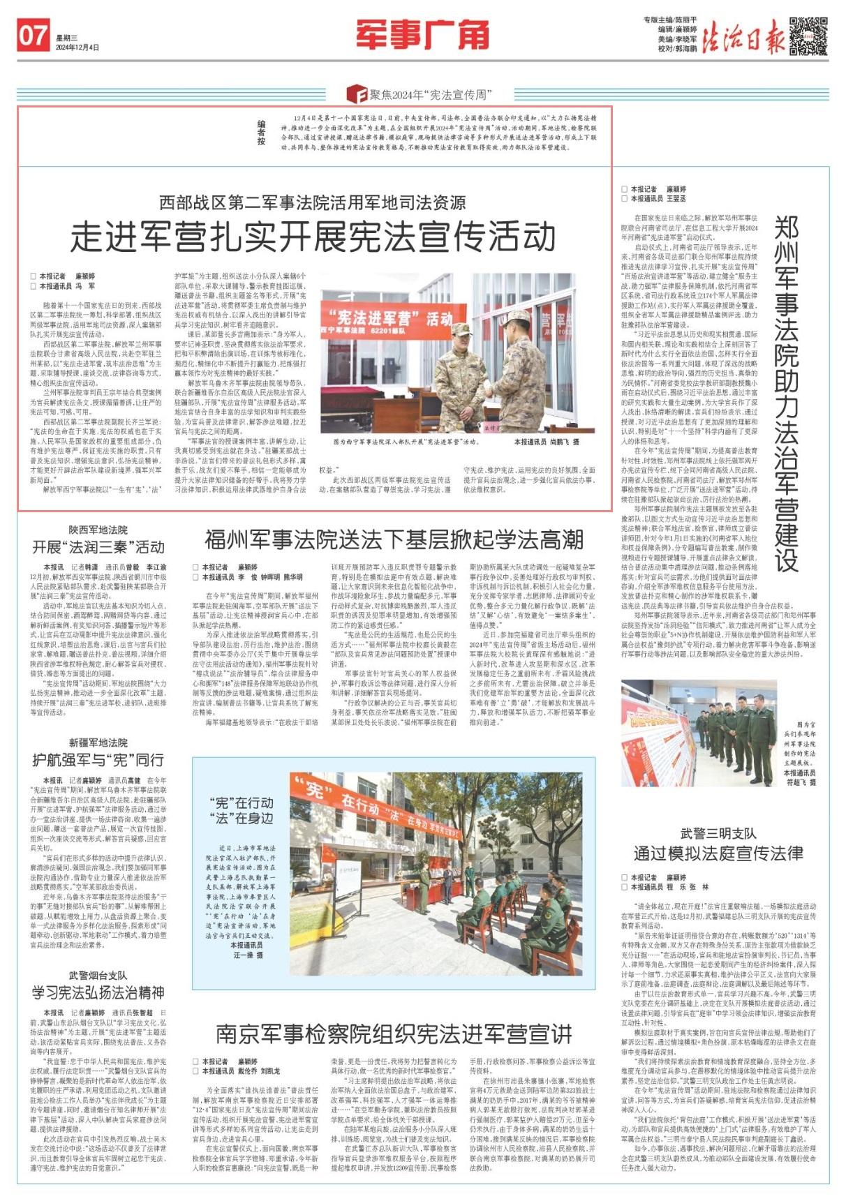 12月4日是第十一個國家憲法日,日前,中央宣傳部、司法部、全國普法辦聯(lián)合印發(fā)通知,以“大力弘揚憲法精神,推動進一步全面深化改革”為主題,在全國組織開展2024年“憲法宣傳周”活動。活動期間,軍地法院、檢察院聯(lián)合部隊,通過宣講授課、贈送法律書籍、模擬庭審、現(xiàn)場提供法律咨詢等多種形式開展送法進軍營活動,形成上下聯(lián)動、共同參與、整體推進的憲法宣傳教育格局,不斷推動憲法宣傳教育取得實效,助力部隊法治軍營建設(shè)。