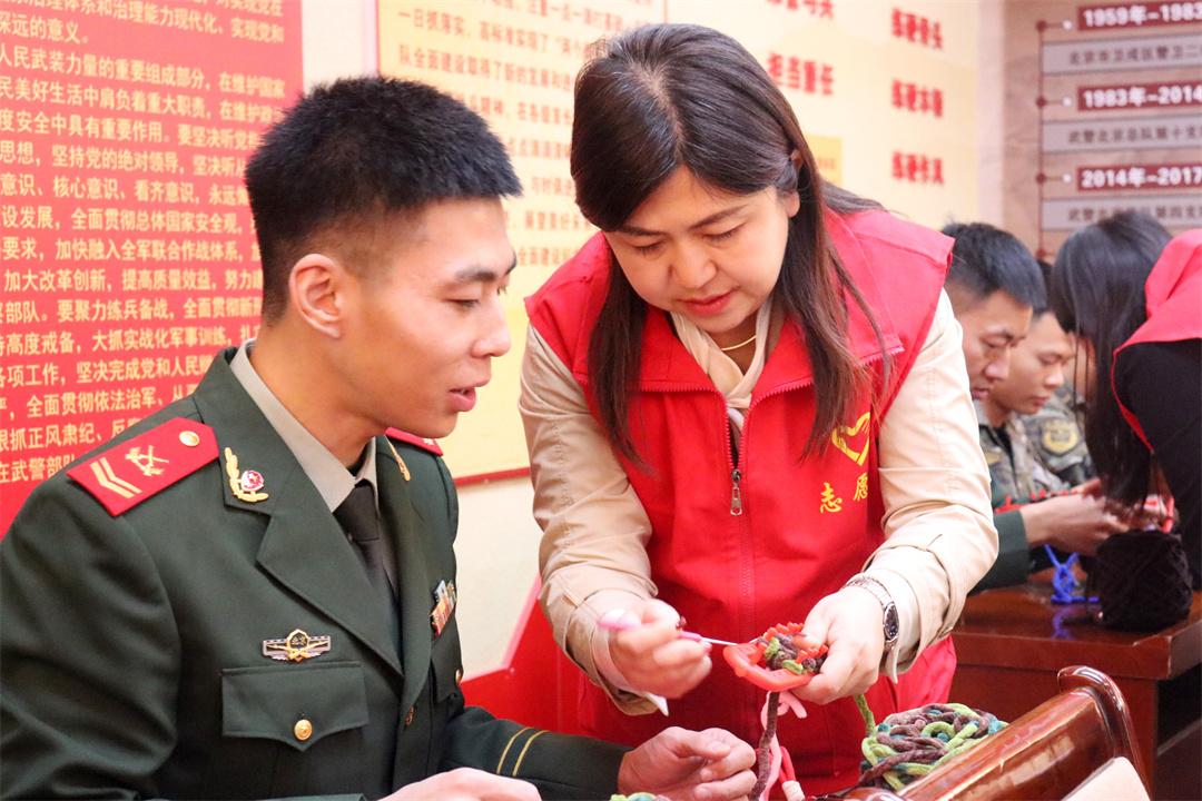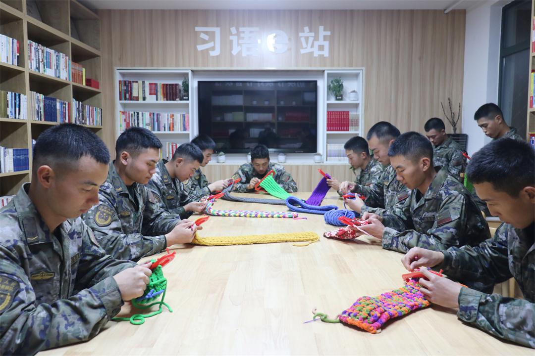 圖為武警官兵利用課余時間為孩子們編織圍巾。