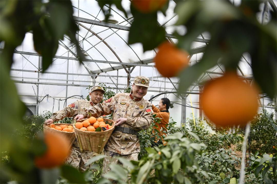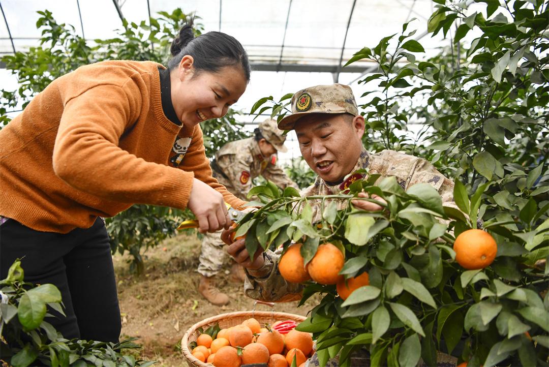 1月9日,安徽省合肥市廬江縣人武部組織“民兵助農(nóng)志愿者小分隊(duì)”,來到廬江縣羅河鎮(zhèn)鮑店村幫助果農(nóng)采收冬橙,搶抓時(shí)節(jié)供應(yīng)市場(chǎng)。圖為民兵在鮑店村幫果農(nóng)采摘冬橙。