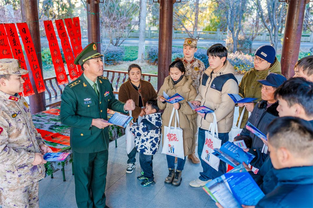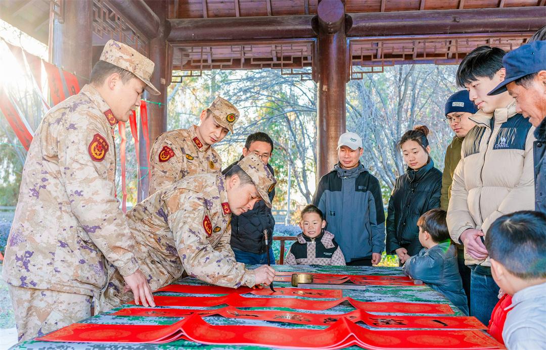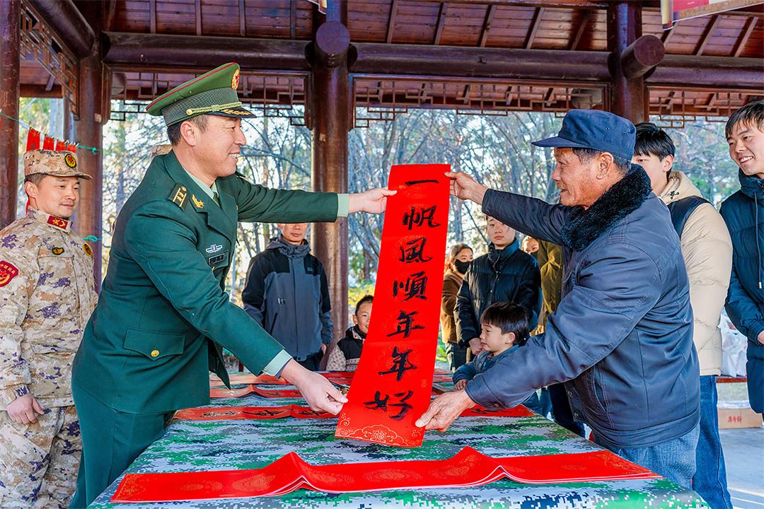 1月15日,安徽省馬鞍山市博望區(qū)人武部組織現(xiàn)役官兵、文職人員、基干民兵走進(jìn)村鎮(zhèn)文化中心廣場(chǎng),開(kāi)展“寫春聯(lián)·送祝福·迎新春”慰問(wèn)專項(xiàng)活動(dòng)。圖為官兵給駐地群眾送上新春祝福。