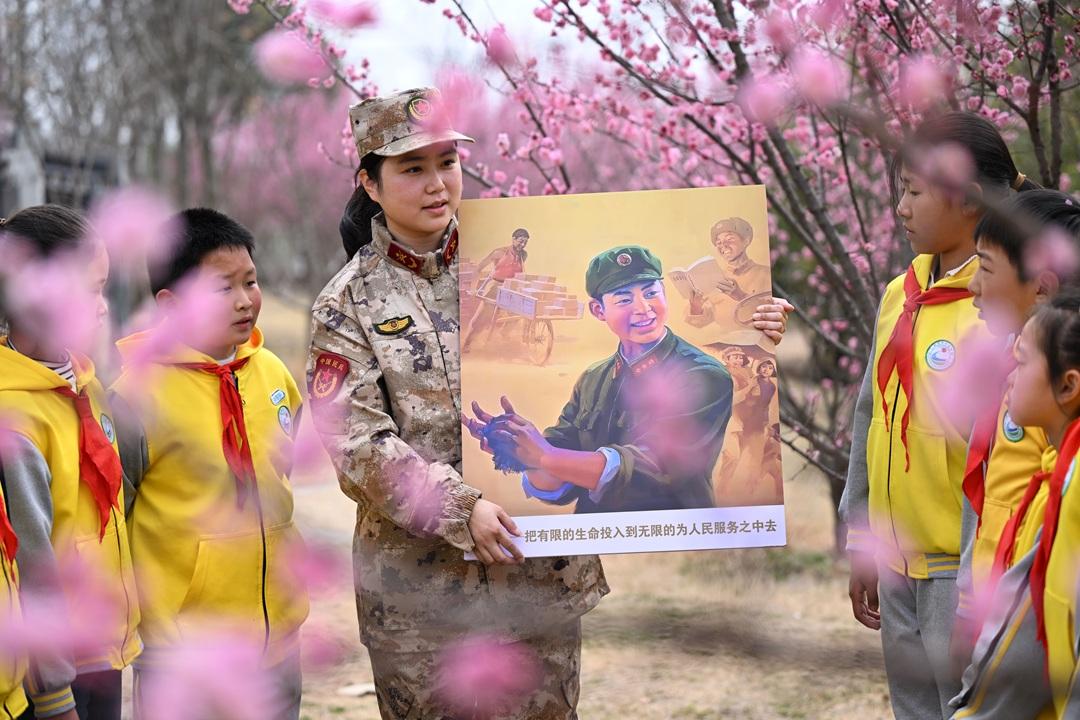 圖為肥西縣紫蓬鎮(zhèn)民兵向?qū)W生講述雷鋒故事。