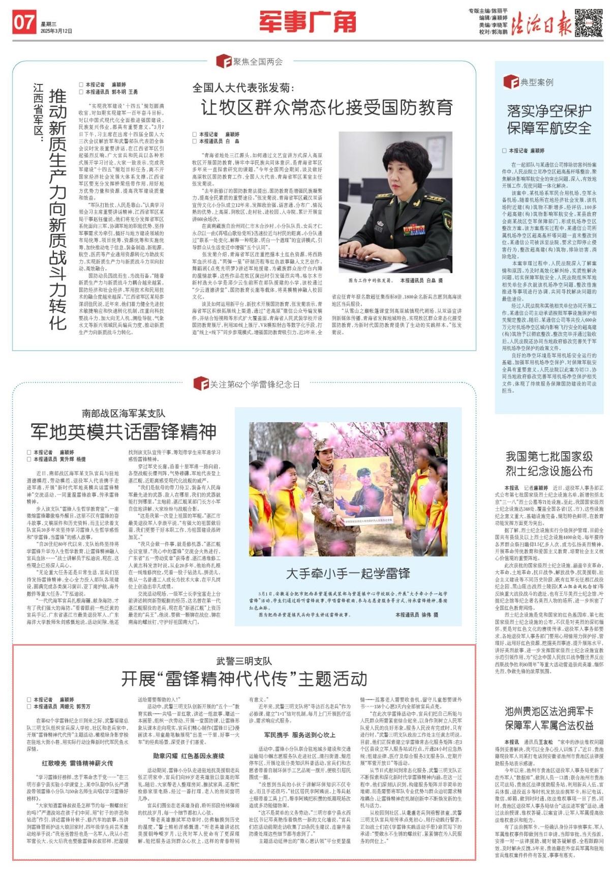 在第62個學(xué)雷鋒紀念日到來之際,武警福建總隊三明支隊組織官兵深入學(xué)校、社區(qū)和老兵家中,開展“雷鋒精神代代傳”主題活動。橄欖綠身影穿梭在駐地大街小巷,用實際行動詮釋新時代軍民魚水深情。