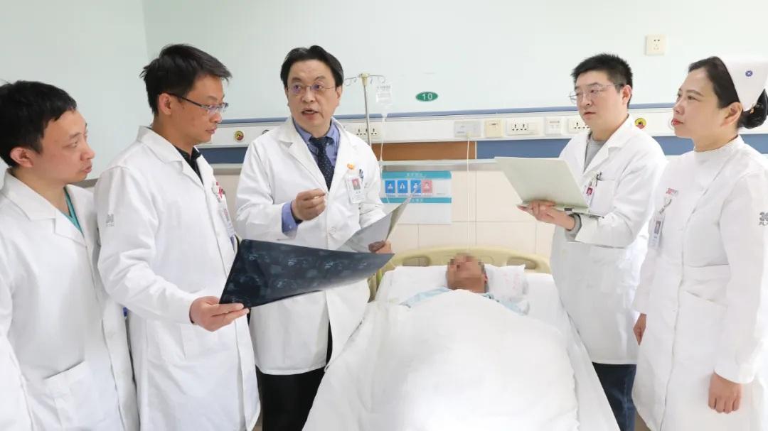 圖為姜?jiǎng)P主任帶領(lǐng)團(tuán)隊(duì)醫(yī)務(wù)人員在查房中討論病情,并指導(dǎo)手術(shù)后的病人進(jìn)行科學(xué)訓(xùn)練,加快康復(fù)進(jìn)度。