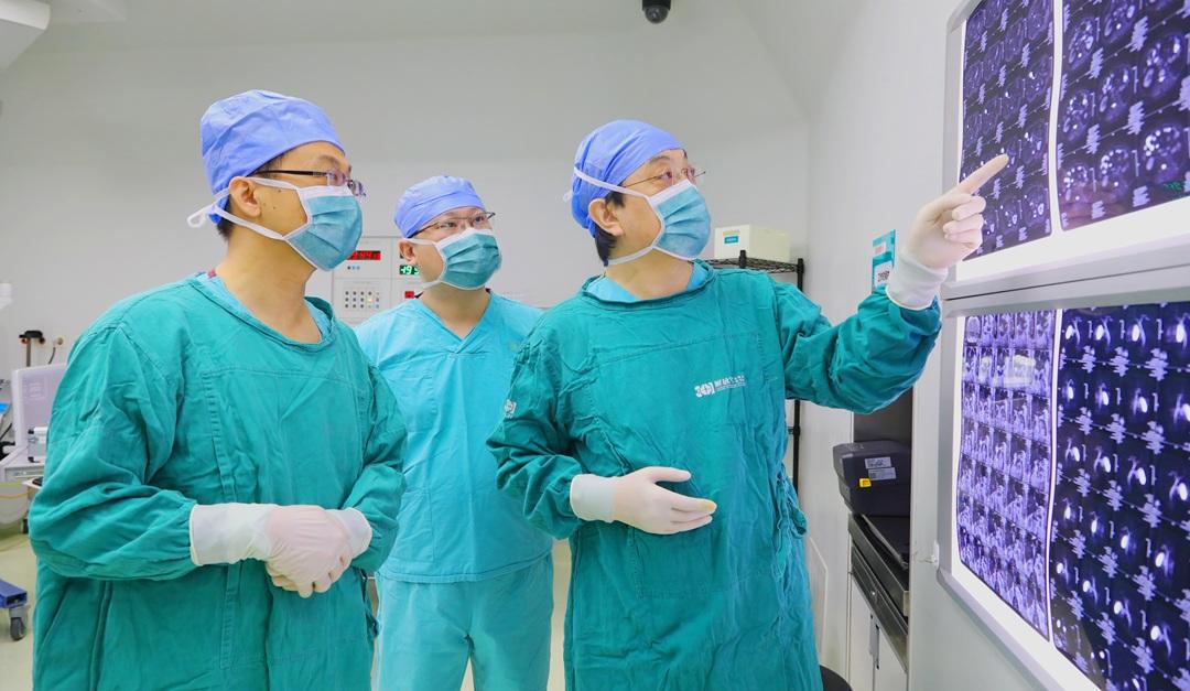 圖為姜?jiǎng)P主任團(tuán)隊(duì)一邊查閱核磁膠片一邊討論手術(shù)細(xì)節(jié),制定周密方案,確保手術(shù)萬無一失。
