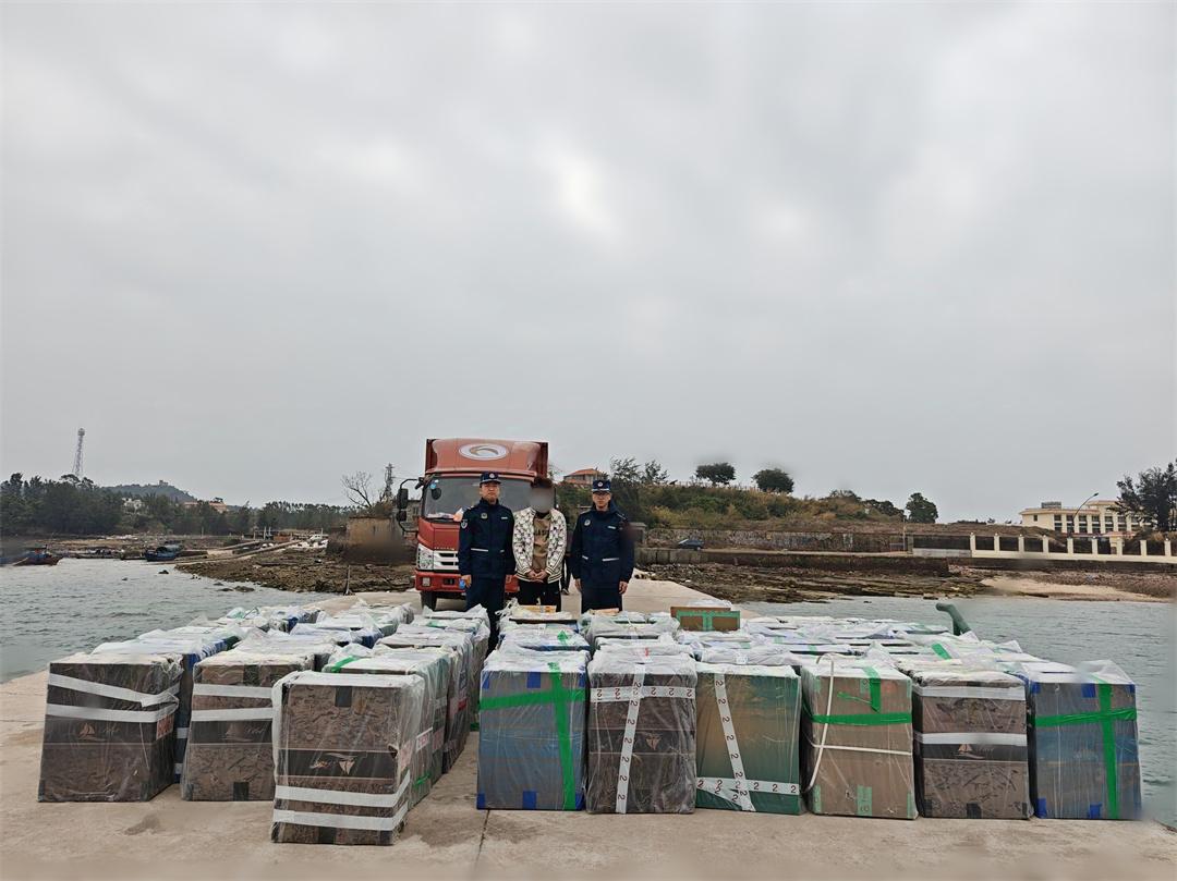 圖為2月20日,廣西海警局在廣西珍珠灣海域查獲香煙19996條。