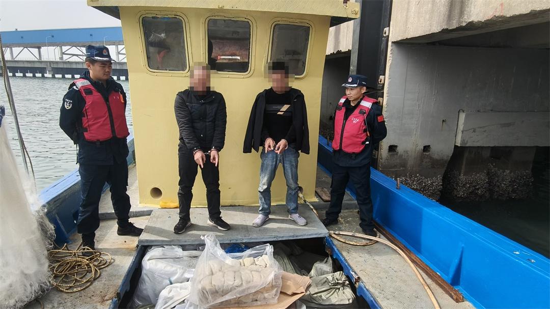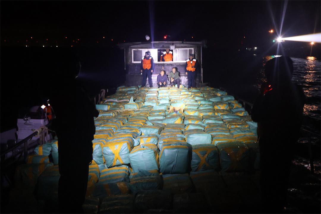 圖為2月20日,廣西海警局執(zhí)法艇位廣西東興市江平鎮(zhèn)巫頭十涵附近海域,查獲可疑船排2艘查獲凍品4.5噸。