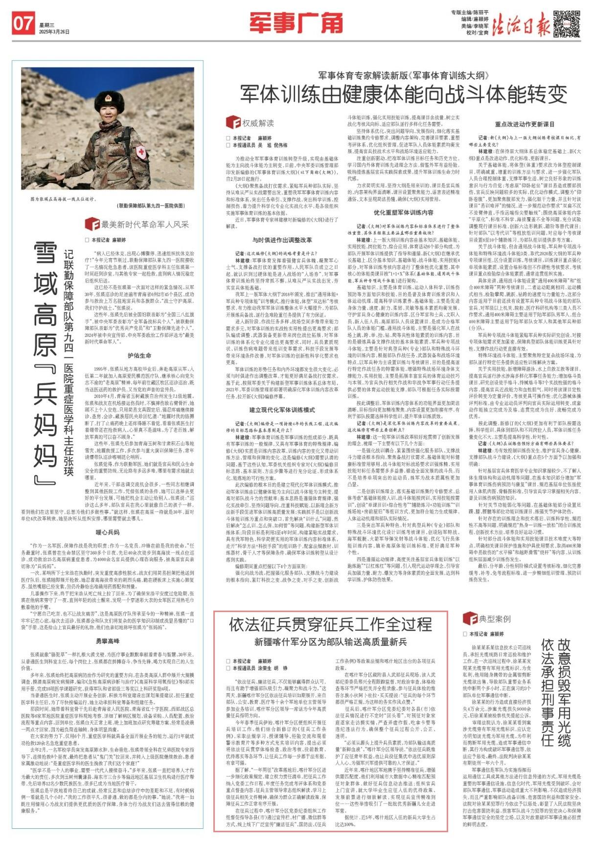 “必須從源頭上提升兵員素質(zhì),為部隊輸送高質(zhì)量‘新鮮血液’?!笨κ曹姺謪^(qū)領(lǐng)導說,“依法征兵既維護了應(yīng)征青年權(quán)益,也讓兵役征集優(yōu)中選優(yōu)原則深入人心,為強軍興軍提供可靠的人才保證?!?/p>