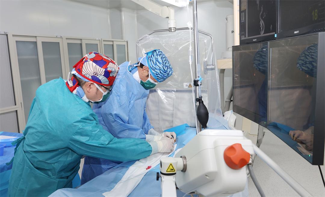 早一秒手術(shù)就多一絲康復(fù)希望。劉愛軍馬上抽組科室精干力量組成專家救治小組,實施導(dǎo)管介入取栓手術(shù)。醫(yī)護人員從右側(cè)大腿腹股溝股動脈處建立通路,在支架輔助下,取栓導(dǎo)管安全精準抵達堵塞血管處。不多久,在劉愛軍團隊細心操作下,比頭發(fā)還細的導(dǎo)絲成功穿過血栓,并引領(lǐng)支架成功取出血栓。