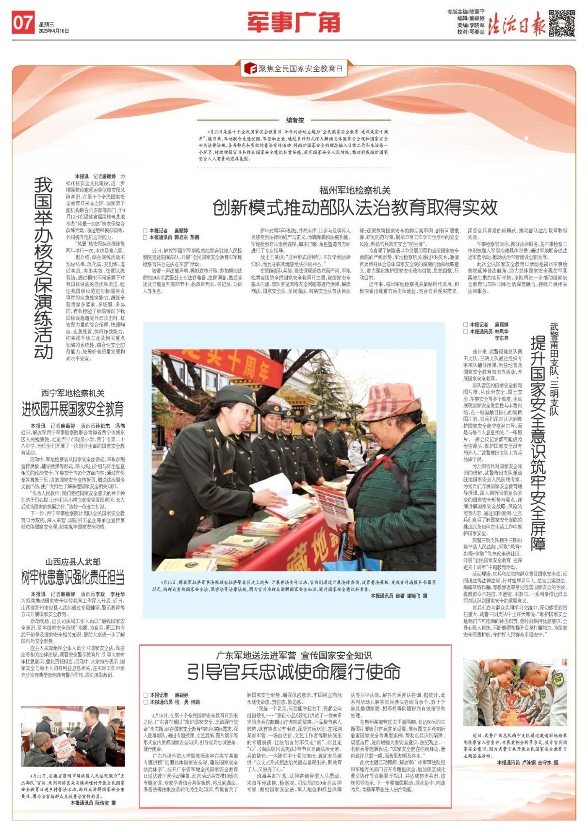 4月15日,在第十個(gè)全民國家安全教育日到來之際,廣東省軍地以“維護(hù)國家安全,忠誠履行使命”為主題,結(jié)合國家安全教育與部隊(duì)實(shí)際需求,深入駐粵部隊(duì),通過專題授課、文藝展演、圖片展示等形式宣傳貫徹國家安全知識,引導(dǎo)官兵忠誠使命、履行使命。
