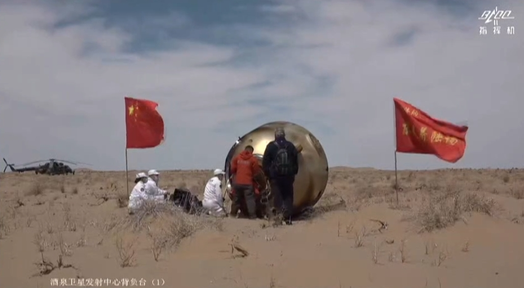 隨著返回艙成功著陸,擔(dān)負(fù)搜救回收任務(wù)的搜救分隊(duì)及時(shí)發(fā)現(xiàn)目標(biāo),并抵達(dá)著陸現(xiàn)場(chǎng)。