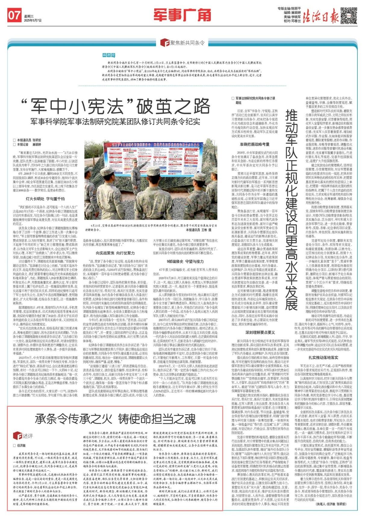 軍事科學(xué)院自建院以來,已連續(xù)9次承擔(dān)共同條令編修任務(wù)。這是一份沉甸甸的責(zé)任,更是一段充滿榮光與傳承的歷史。今年2月14日,習(xí)主席簽署命令發(fā)布新修訂的共同條令,標(biāo)志著軍隊法治化水平邁上新臺階,再次彰顯了新時代條令人的使命與擔(dān)當(dāng)。