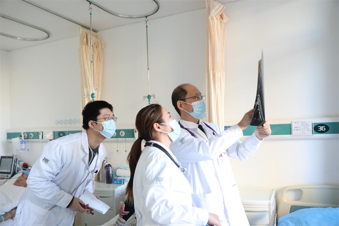 圖為胸外科主任宋偉安帶領(lǐng)團(tuán)隊研究胸部CT和病情資料。