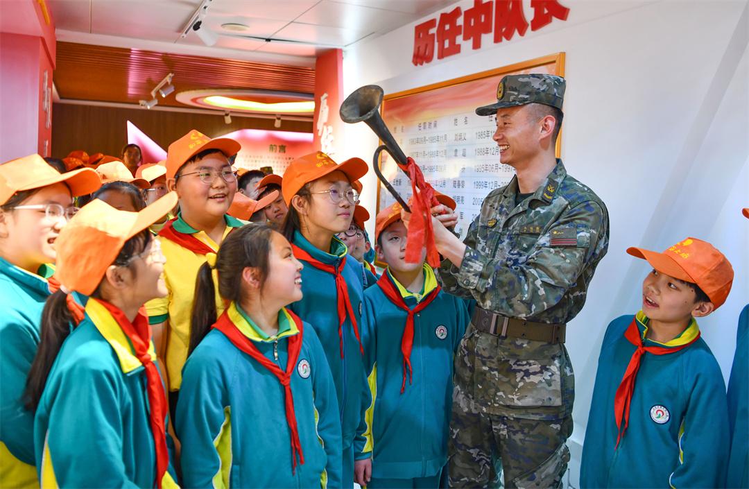 圖為在軍營(yíng)開(kāi)放日活動(dòng)中,中隊(duì)?wèi)?zhàn)士向?qū)W生講述老軍號(hào)的故事。徐偉 攝