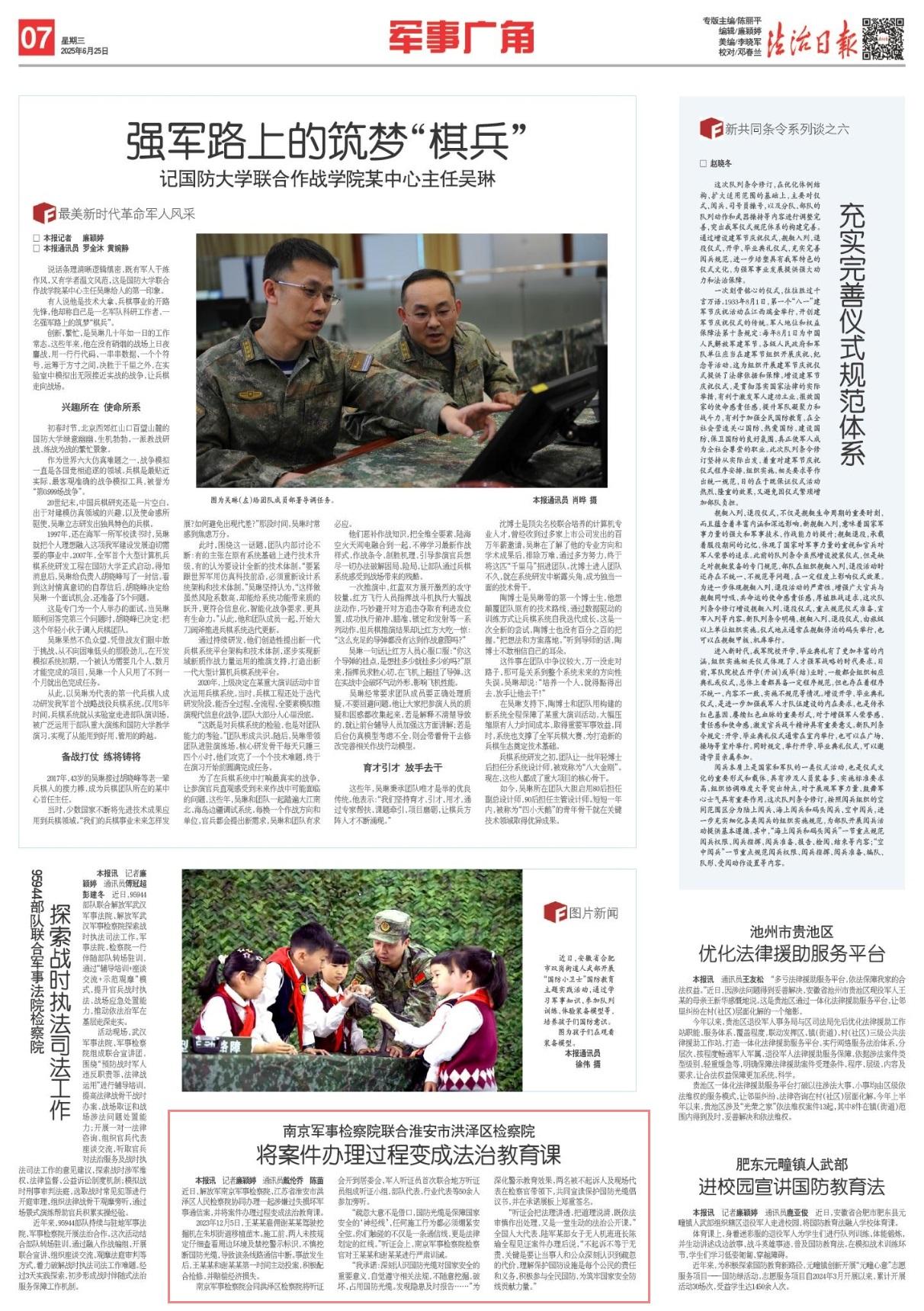 近日,解放軍南京軍事檢察院、江蘇省淮安市洪澤區(qū)人民檢察院協(xié)同辦理一起涉嫌過失損壞軍事通信案,并將案件辦理過程變成法治教育課。