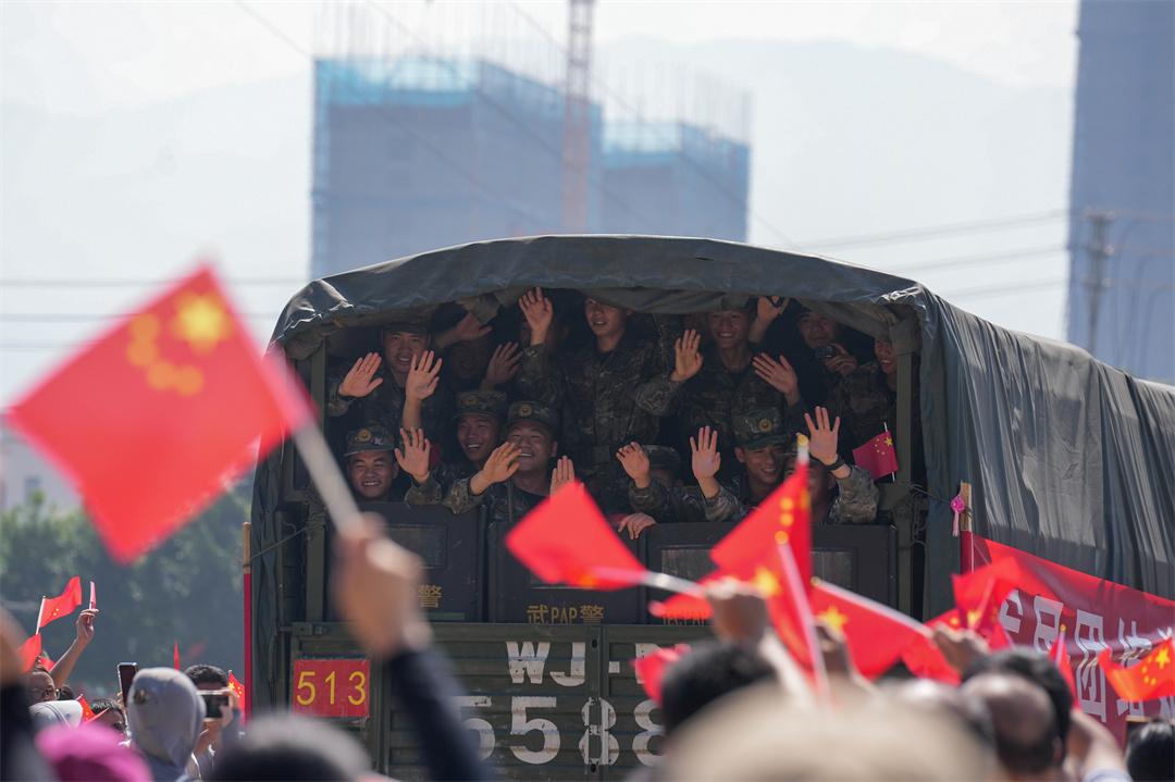 圖為完成抗洪搶險任務(wù)后,武警官兵向送行人群揮手告別。趙浩翔 攝