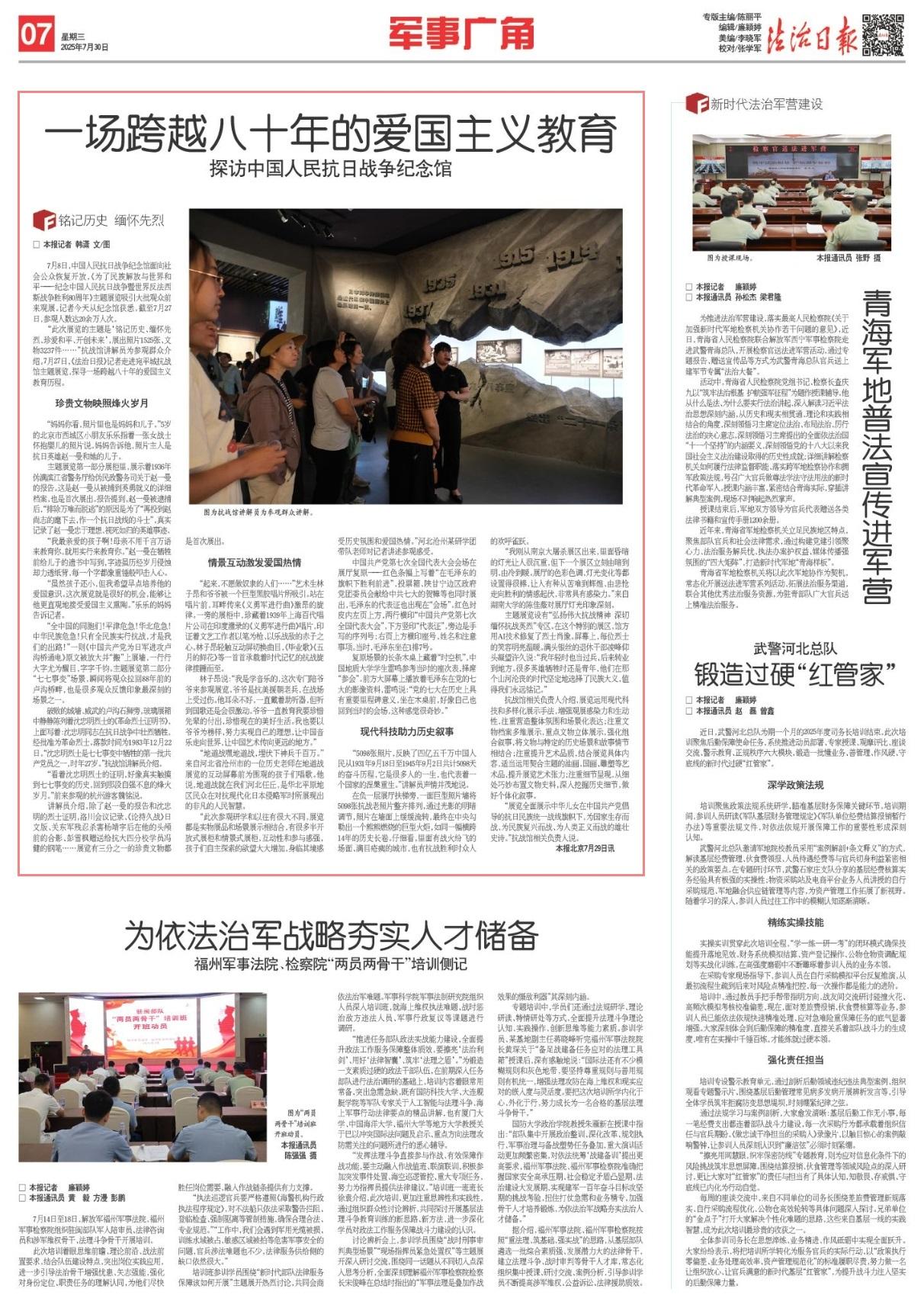 “此次展覽的主題是‘銘記歷史、緬懷先烈、珍愛和平、開創(chuàng)未來’,展出照片1525張、文物3237件……”抗戰(zhàn)館講解員為參觀群眾介紹。7月27日,《法治日報(bào)》記者走進(jìn)宛平城抗戰(zhàn)館主題展覽,探尋一場跨越八十年的愛國主義教育歷程。
